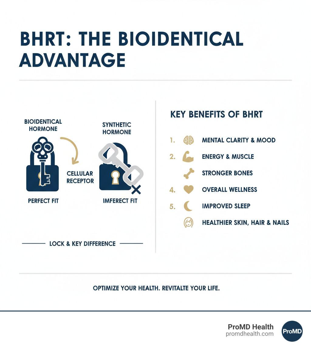 Not all hormone replacement therapies are created equal. Bioidentical Hormone Replacement Therapy (BHRT) stands out because it uses hormones designed to be structurally identical to those your body naturally produces. Think of it as a perfect “lock and key” fit for your body’s cells, which is why your body recognizes them as its own.