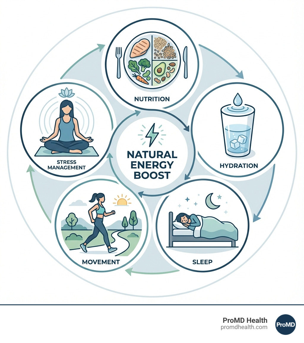Boost energy levels naturally by focusing on five key areas: eating whole foods and staying hydrated, getting 7-9 hours of quality sleep, incorporating regular movement (even just 10-minute walks), managing stress effectively, and addressing potential vitamin deficiencies or hormonal imbalances.