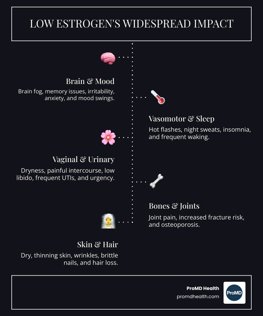 Estrogen deficiency symptoms affect far more than just your reproductive system. When estrogen levels drop, the effects ripple through nearly every part of your body—from your brain and bones to your skin and heart.