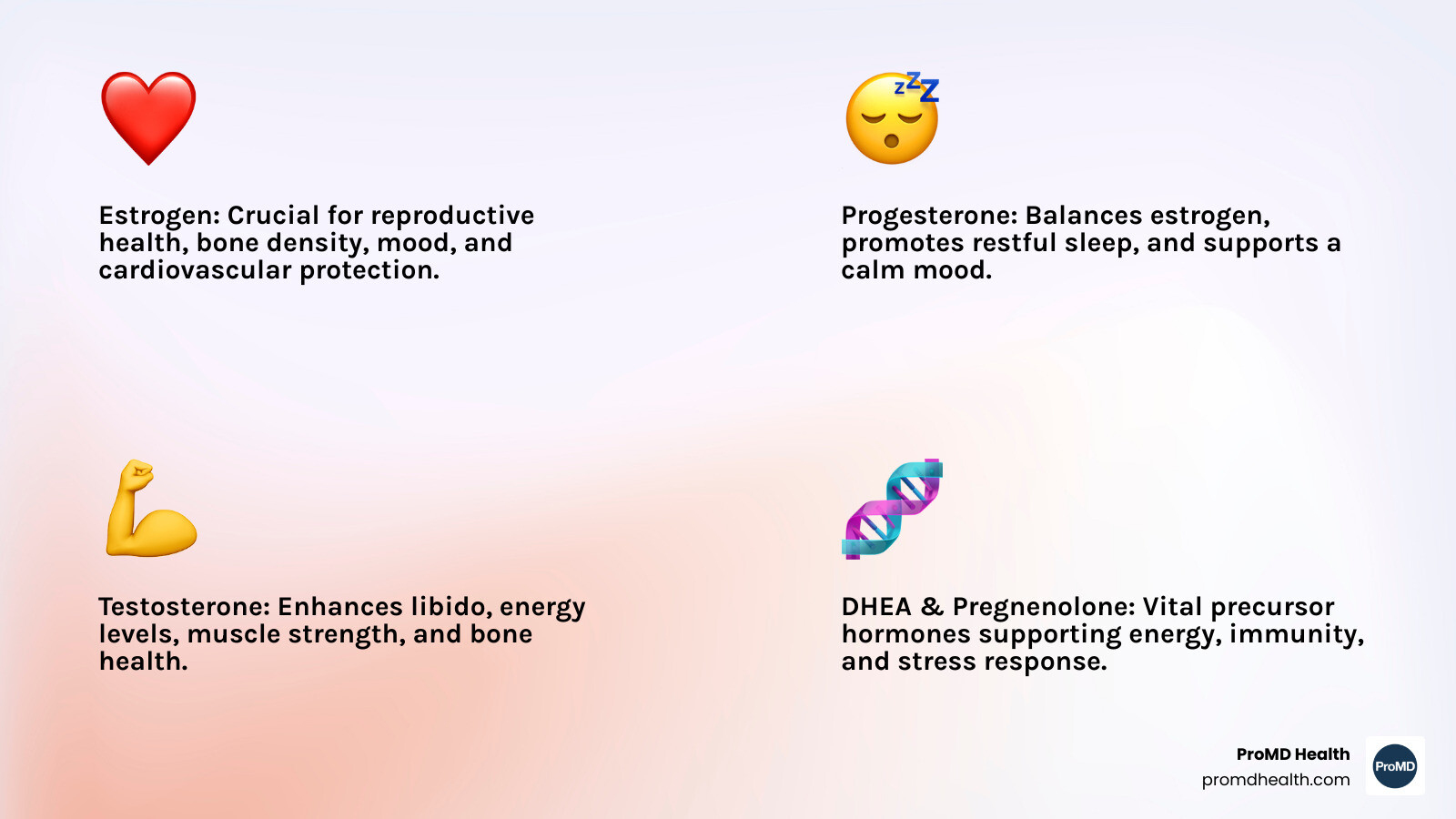 - Focuses on key hormones including estrogen, progesterone, testosterone, DHEA, and pregnenolone