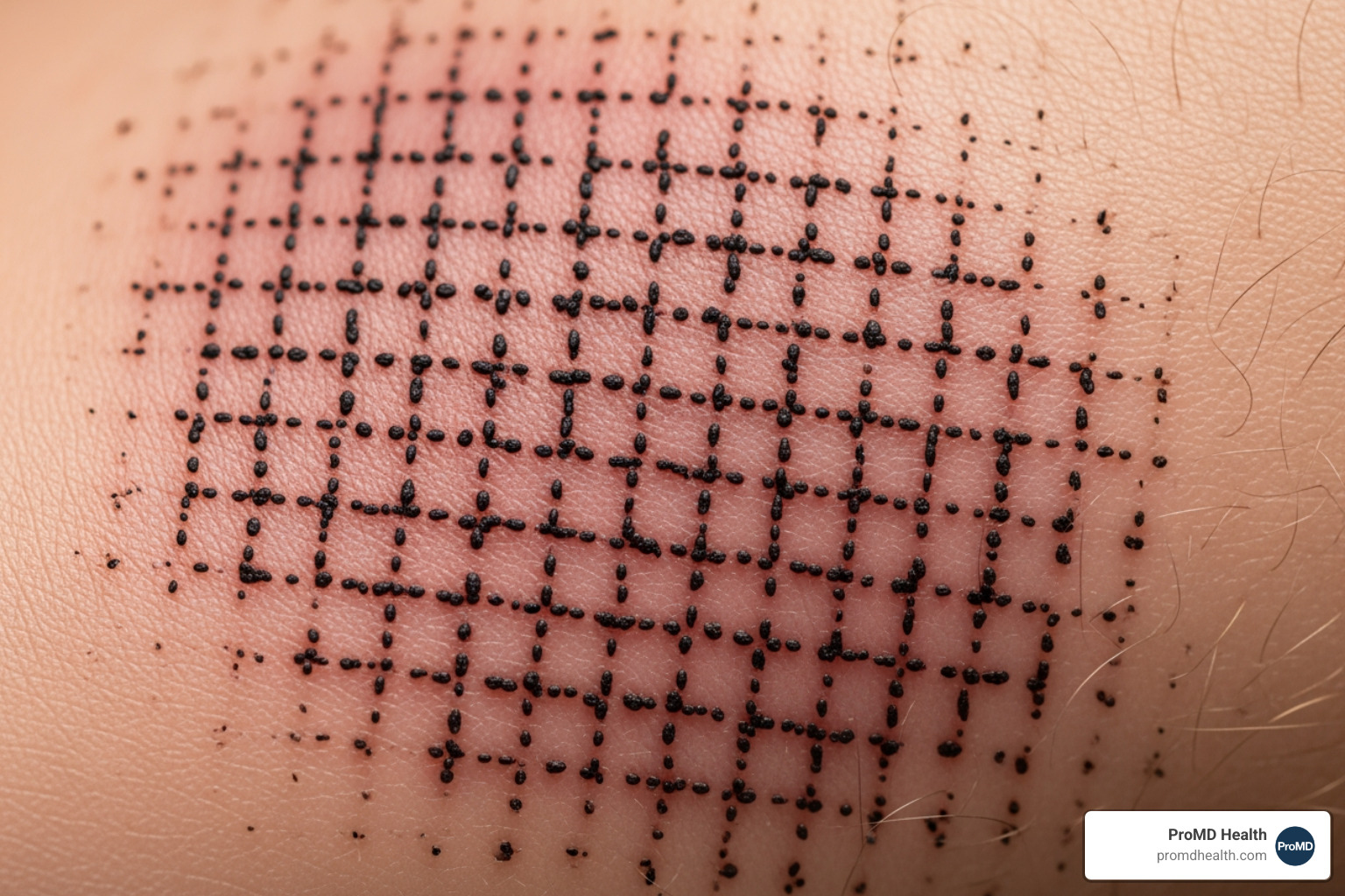 Dot-like pattern of carbon crusts on skin immediately after fibroblast treatment - fibroblast treatment