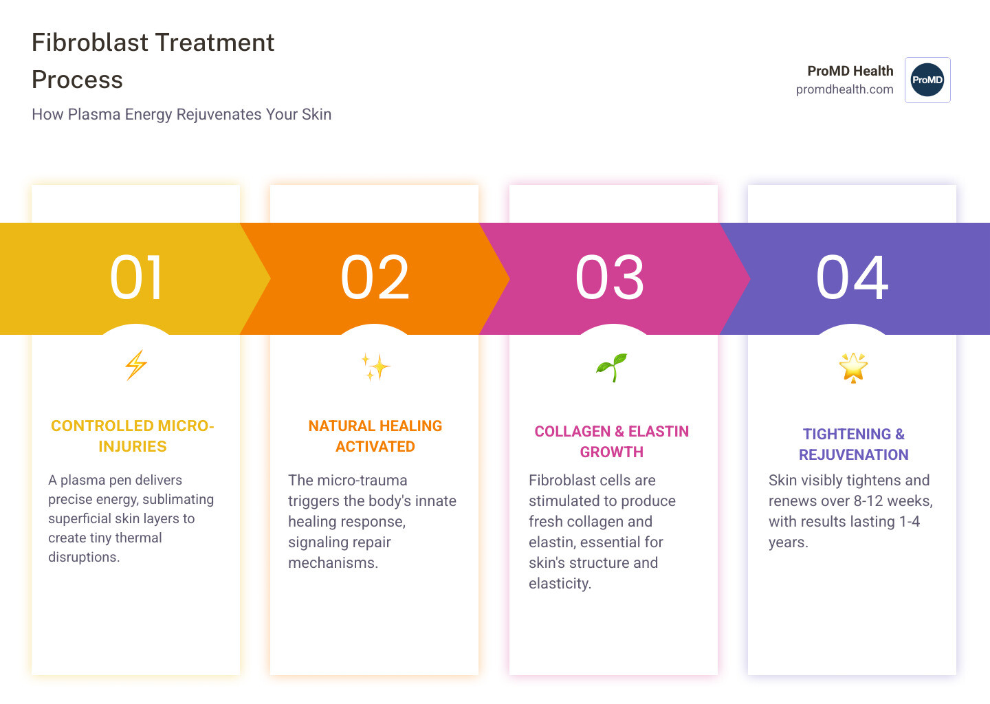 Infographic showing fibroblast treatment process: Step 1 - Plasma pen creates controlled micro-injuries on skin surface. Step 2 - Body's natural healing response is triggered. Step 3 - Fibroblast cells produce new collagen and elastin. Step 4 - Skin tightens and rejuvenates over 8-12 weeks. Timeline shows immediate carbon crust formation, 5-7 days of healing, and full results visible at 8-12 weeks. Benefits listed: non-surgical, minimal downtime, long-lasting results of 1-4 years. - fibroblast treatment infographic pillar-4-steps