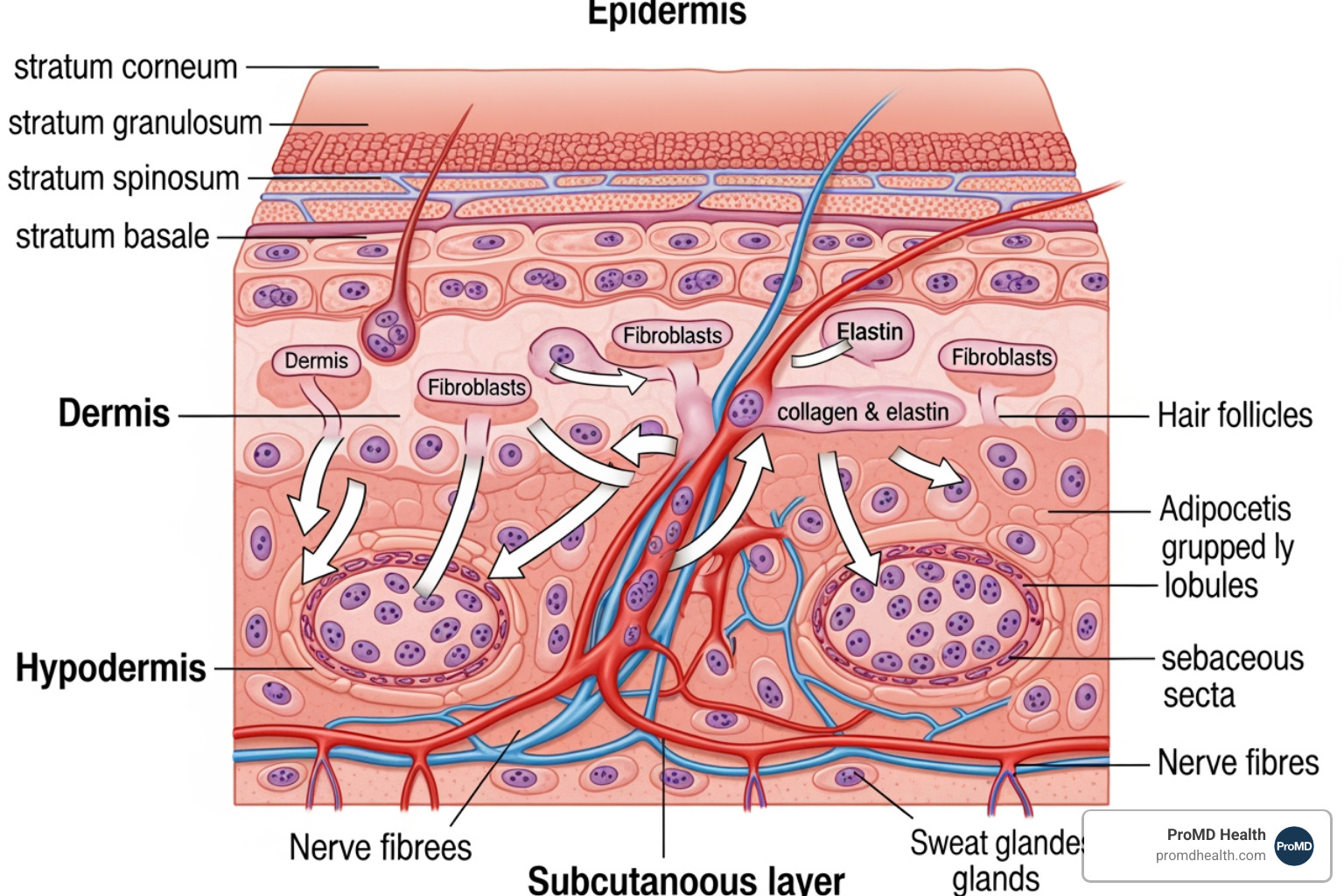 Diagram illustrating skin layers and fibroblast stimulation - fibroblast treatment