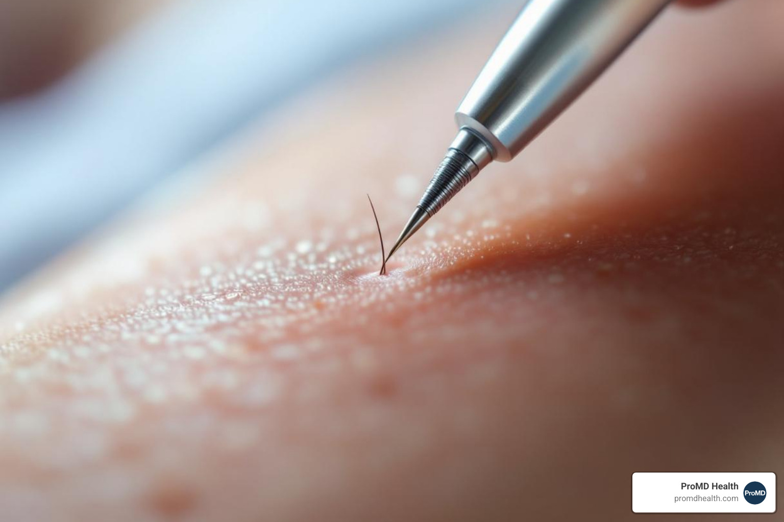 Electrolysis works by inserting a fine probe into each hair follicle and delivering an electrical current to destroy the hair root. This meticulous, hair-by-hair approach permanently prevents new growth. As Dr. Blair Murphy-Rose explains, the electrical energy heats and permanently damages the follicle.