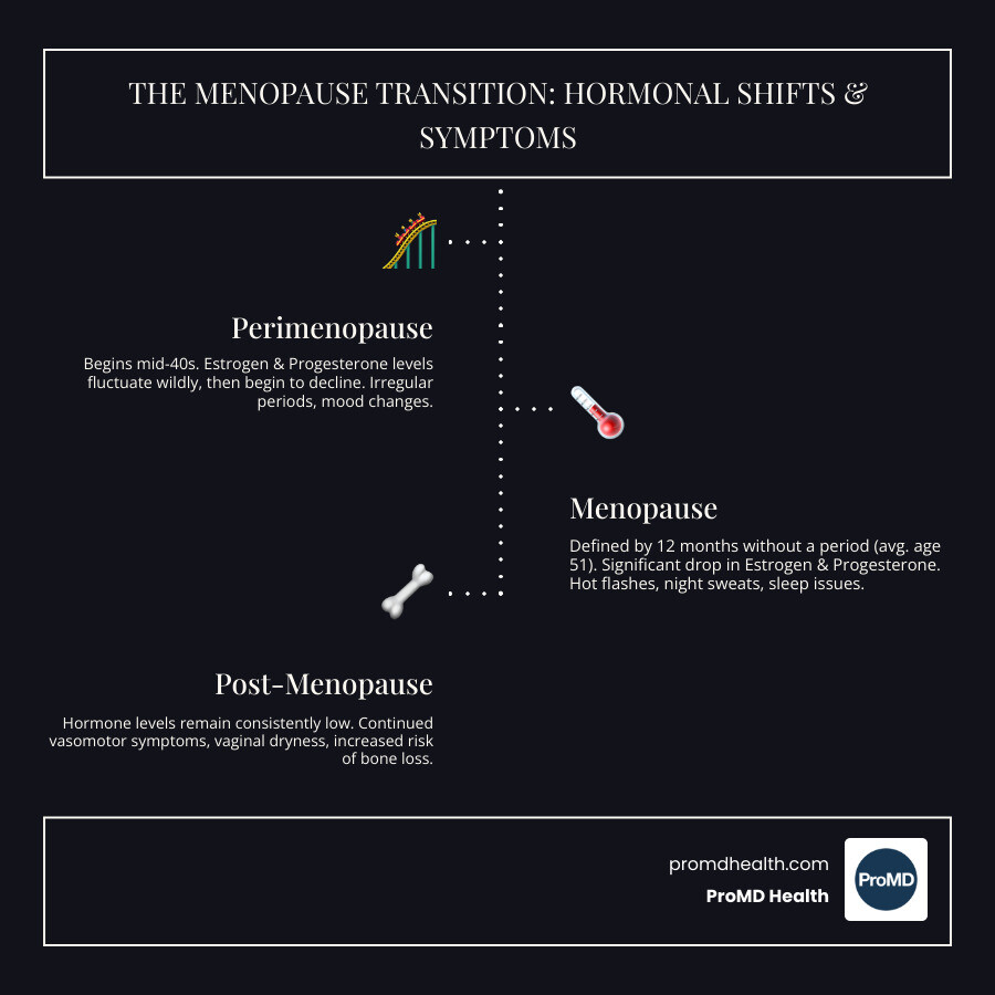 infographic showing estrogen and progesterone levels declining from perimenopause through menopause, with common symptoms at each stage including hot flashes, night sweats, irregular periods, vaginal dryness, and mood changes - hrt for menopause infographic infographic-line-3-steps-dark