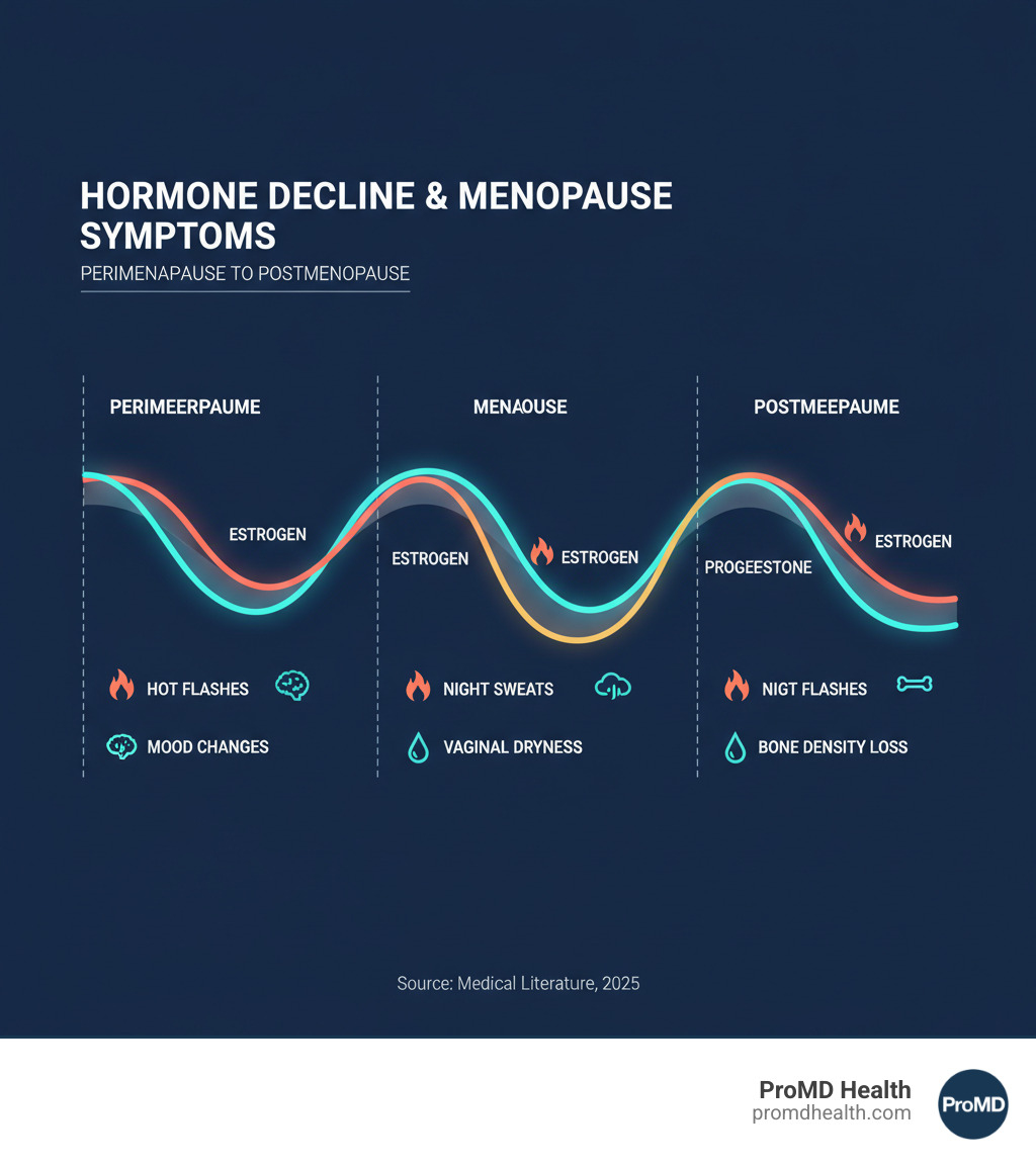 infographic showing estrogen and progesterone levels declining from perimenopause through menopause, with common symptoms listed at each stage including hot flashes, night sweats, vaginal dryness, mood changes, and bone density loss - hrt meaning infographic