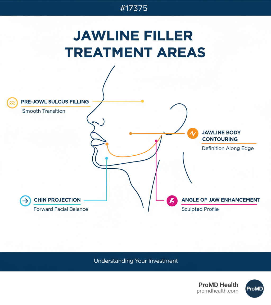 Infographic showing jawline filler treatment areas: chin projection for forward facial balance, pre-jowl sulcus filling to smooth the transition between face and neck, jawline body contouring for definition along the jaw edge, and angle of jaw enhancement for a more sculpted profile - jawline fillers cost infographic