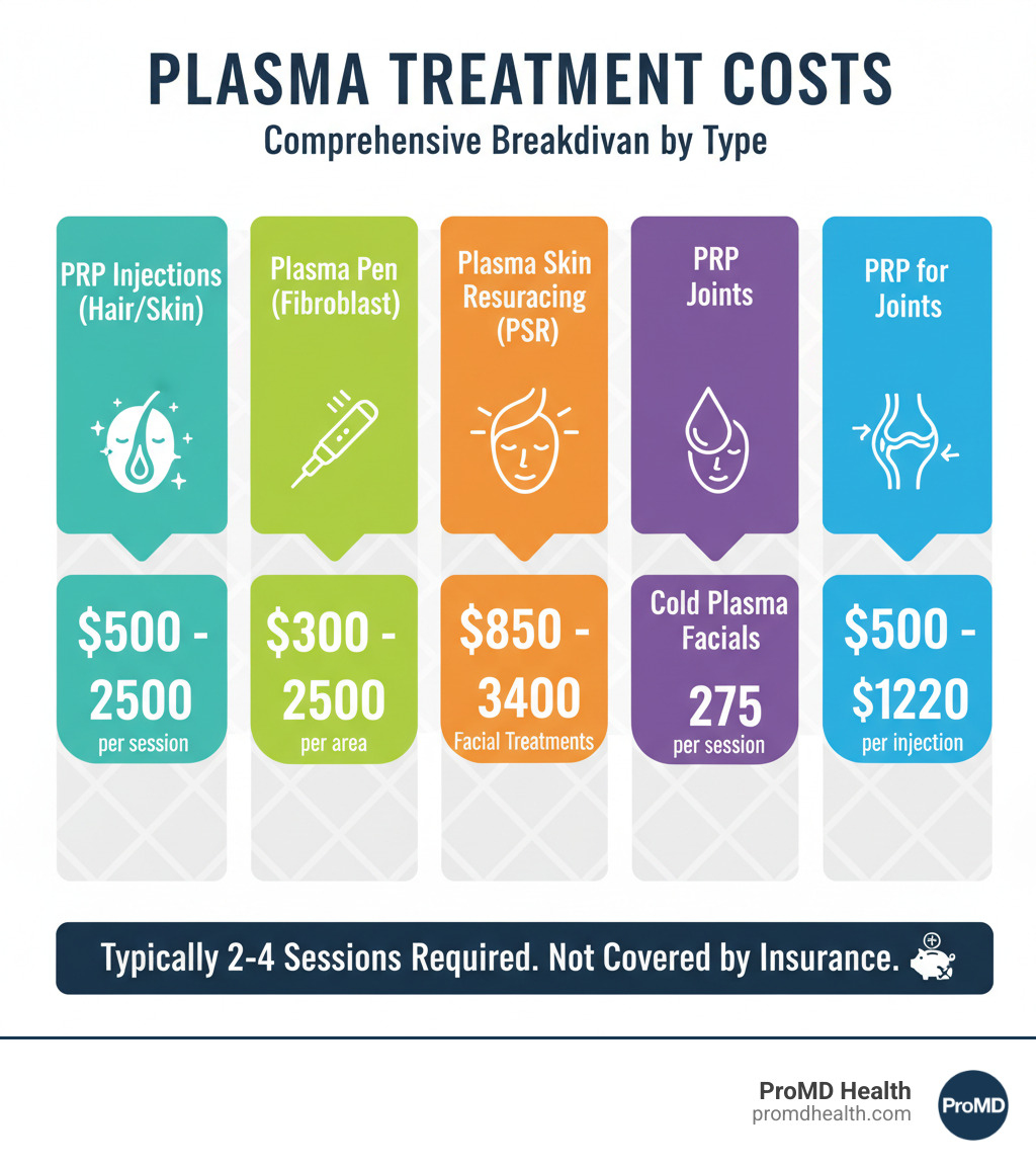 Comprehensive breakdown of plasma treatment costs by type: showing PRP injections averaging $500-2500 per session for hair and skin applications, Plasma Pen treatments ranging $300-2500 depending on treatment area, Plasma Skin Resurfacing from $850-3400 for facial treatments, Cold Plasma Facials at $275 per session, and PRP for joints at $500-1200 per injection, with notation that most treatments require 2-4 sessions and are not typically covered by insurance - Plasma treatment cost infographic