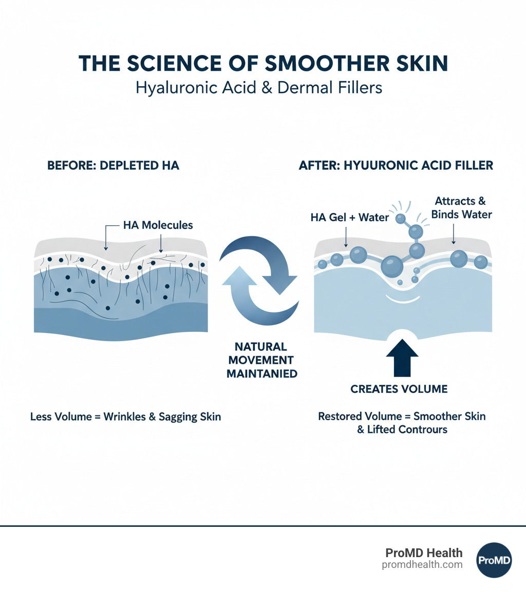 Infographic showing how hyaluronic acid works in the skin: HA molecules attract and bind water molecules, creating volume beneath the skin's surface, smoothing wrinkles and restoring facial contours. The graphic shows cross-sections of skin with depleted HA versus skin with Restylane HA filler, demonstrating how the gel lifts and plumps the treatment area while maintaining natural facial movement. - restylane cost per vial infographic