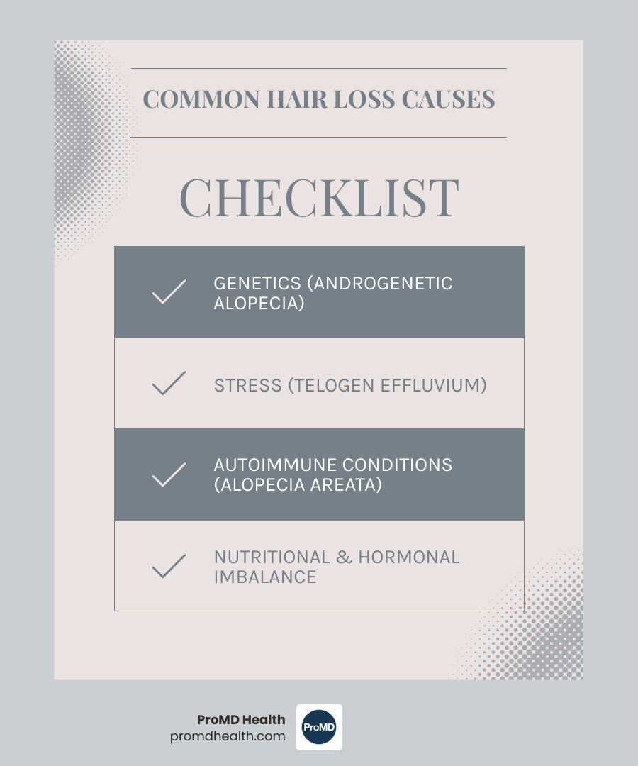 infographic showing common causes of hair loss including genetics (androgenetic alopecia affecting 50 million men and 30 million women), autoimmune conditions (alopecia areata), stress (telogen effluvium), hormonal changes, nutritional deficiencies (iron, zinc, biotin), fungal infections (tinea capitis), and medications or medical treatments - best bald spot treatment infographic checklist-light-blue-grey