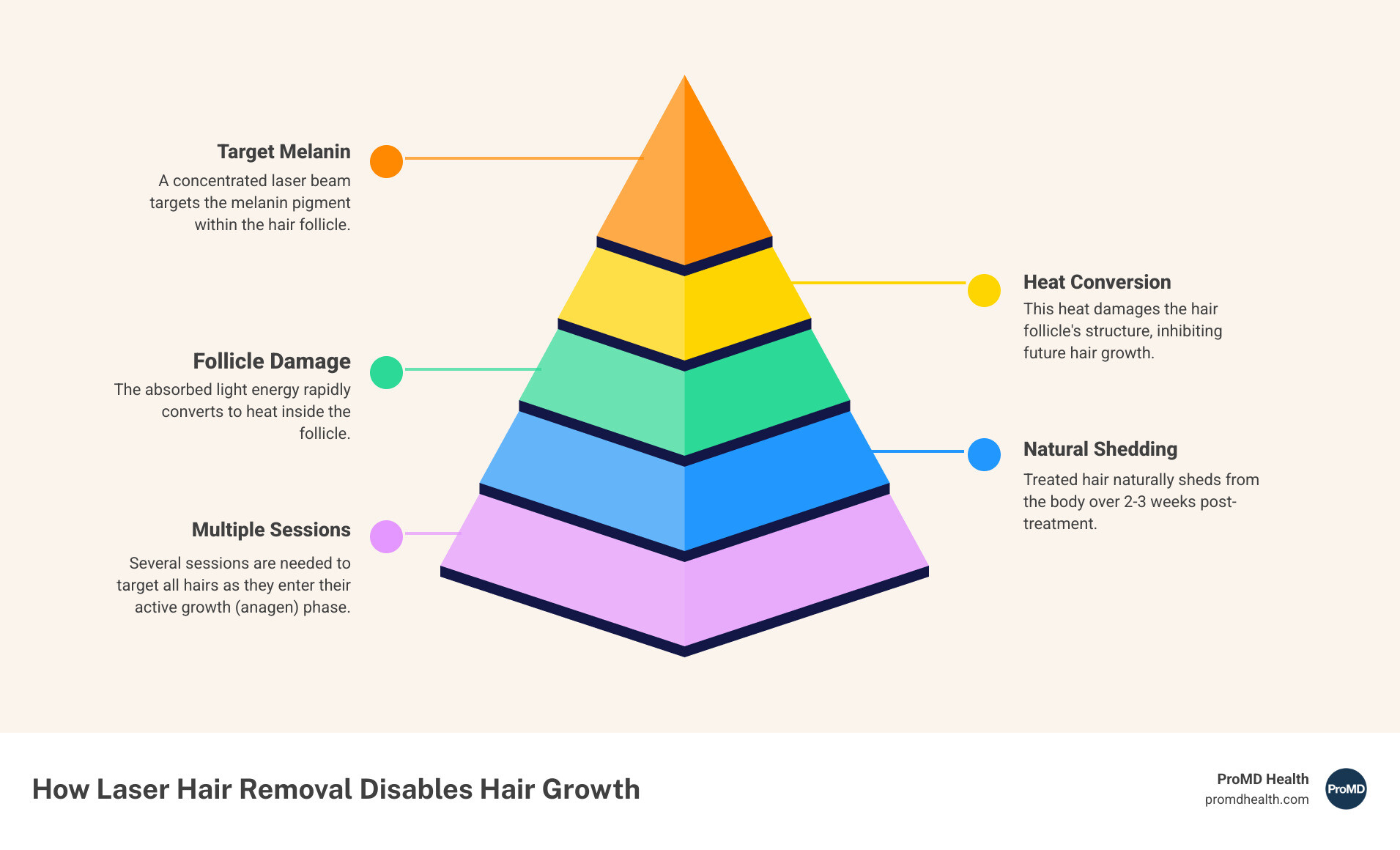 - How Laser Energy Converts to Heat: When melanin absorbs the laser light, the energy converts into heat. This heat travels down the hair shaft to the root.