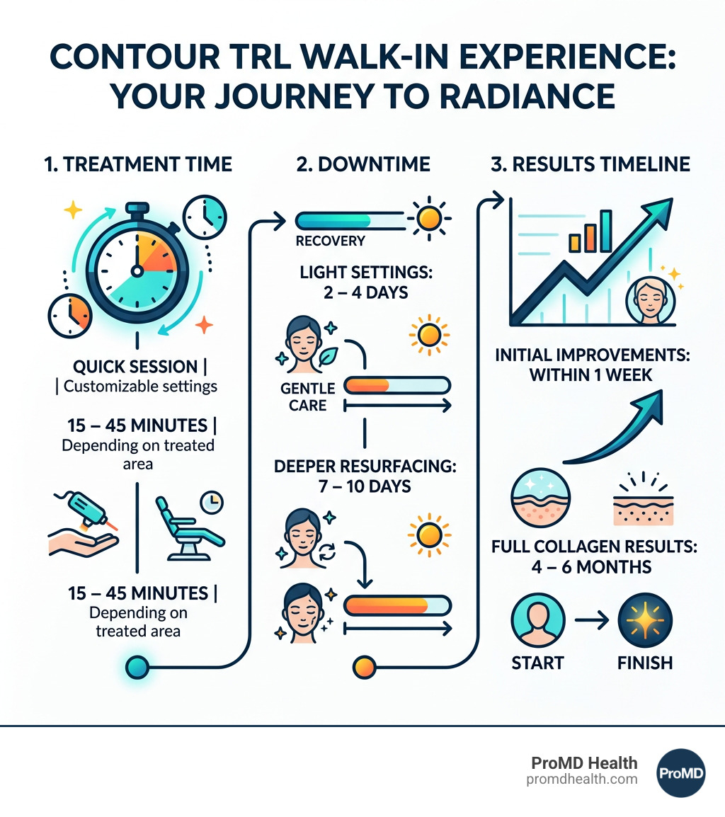 Infographic showing Contour TRL walk in process: treatment time, downtime, and results timeline - contour trl walk in