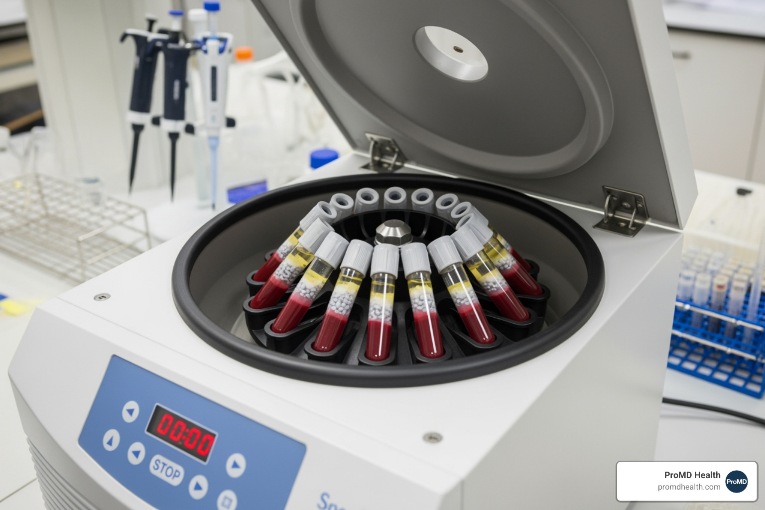 2. Centrifugation: We place your blood into a centrifuge, which spins at high speeds to separate the components by density. The heavy red blood cells sink, the lighter plasma rises, and a platelet-rich layer forms in between.