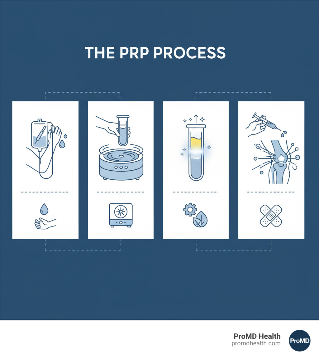 Infographic showing the complete PRP process: blood draw from patient's arm, blood tube being placed in centrifuge machine, separated blood components with concentrated platelet layer highlighted, and final injection into treatment area, with icons representing growth factors and tissue healing - what is prp infographic